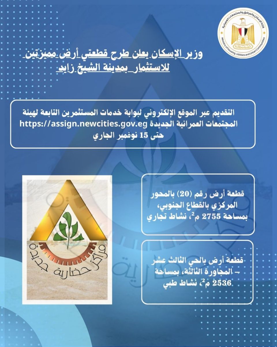 وفي السياق ذاته، أعلن وزير الإسكان عن طرح قطعتي أرض مميزتين للاستثمار بمدينة الشيخ زايد عبر الموقع الإلكتروني لبوابة خدمات المستثمرين التابعة لهيئة المجتمعات العمرانية الجديدة حتى 15 نوفمبر الجاري.