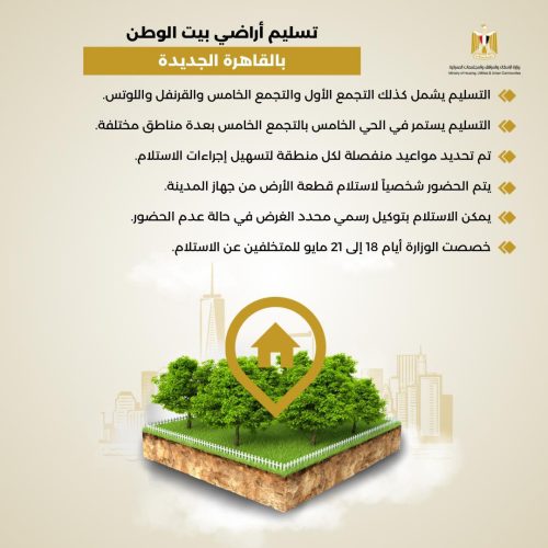 أعلنت المهندسة راندة المنشاوي، وزيرة الإسكان والمرافق والمجتمعات العمرانية، عن تسليم قطع أراضي “بيت الوطن” المرحلة الثامنة والتاسعة للمصريين العاملين بالخارج بعددٍ من المناطق والأحياء بمدينة القاهرة الجديدة، وذلك اعتبارًا من يوم الثلاثاء 24/3/2026، وحتى يوم الخميس 21/5/2026، وفقاً للمواعيد المقررة.