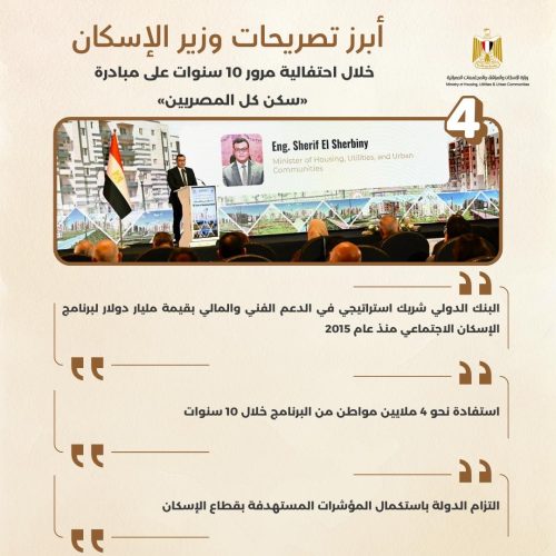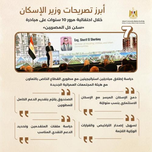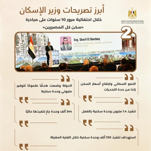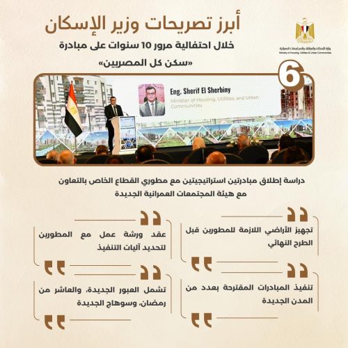 بالإنفوجراف..ننشر أبرز تصريحات وزير الإسكان بمناسبة مرور 10 سنوات على مبادرة «سكن كل المصريين»